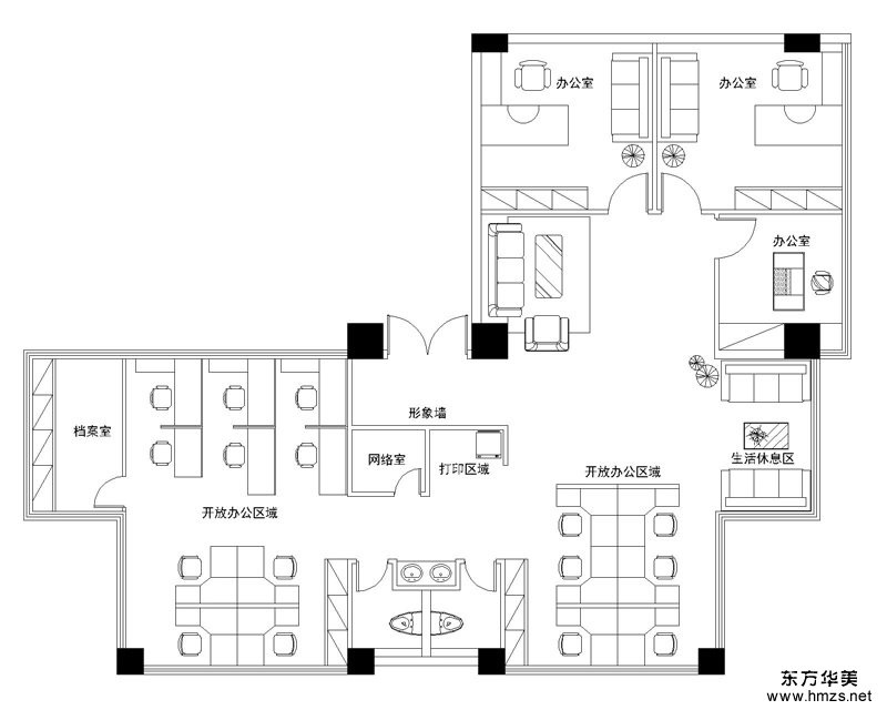 ▄設(shè)計需求: 甲方對辦公空間的功能需求包括前臺接待區(qū)、公共辦公區(qū)、會議室、董事長辦公室、走廊、茶水間、財務(wù)室等,此外甲方希望可以將現(xiàn)有家具要合理利用上。設(shè)計師根據(jù)客戶要求,完成了平面布置圖。